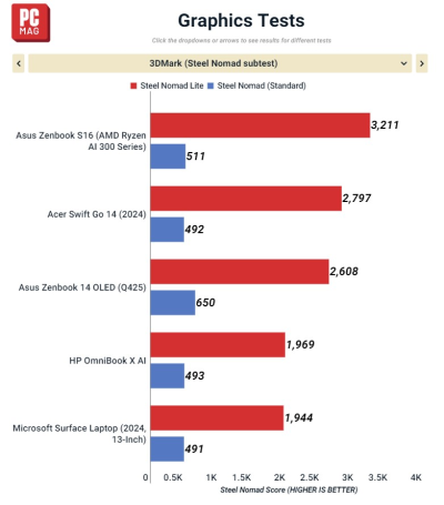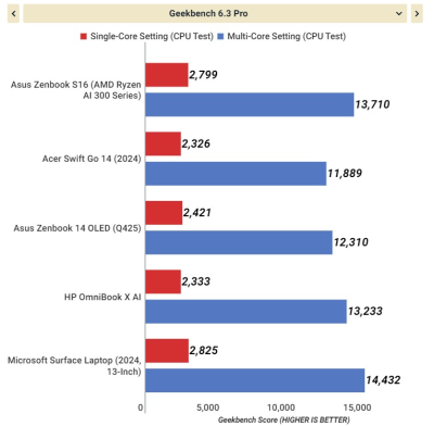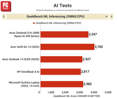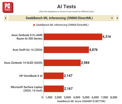 Также обозреватели похвалили ИИ-производительность Ryzen AI 9 HX 370. Например, PCMag отмечает, что чип AMD обеспечивает в три раза более высокую производительность в тесте Geekbench ML по сравнению с ноутбуком HP OmniBook X AI на базе Arm-процессора Qualcomm Snapdragon X Elite (X1E-78-100).