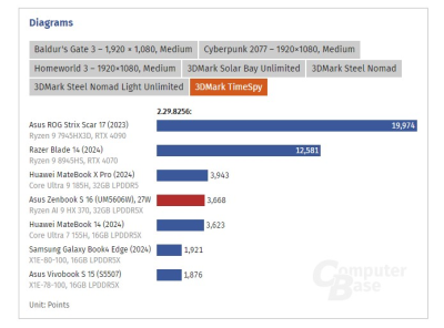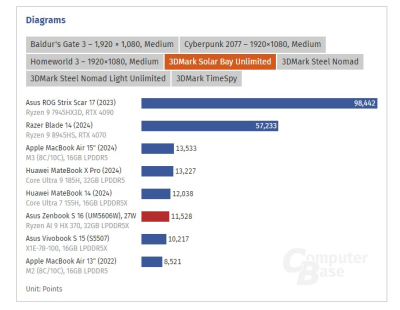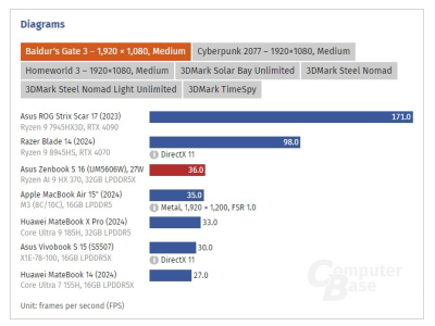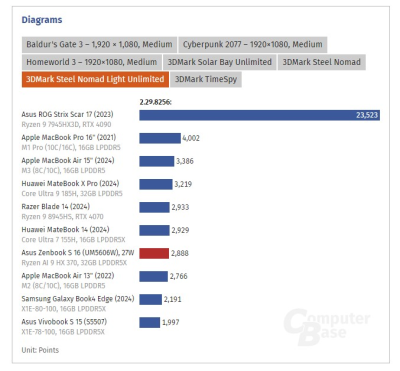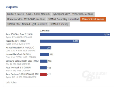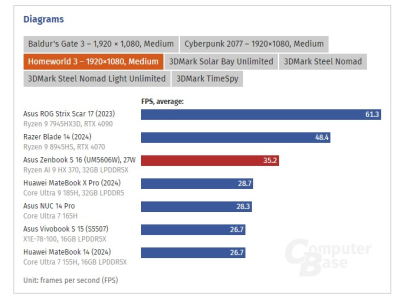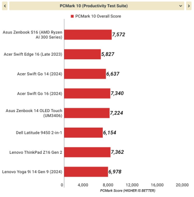 Процессор получил 24 Мбайт кеш-памяти L3 (16 Мбайт для кластера Zen 5 и 8 Мбайт для кластера Zen 5c) и оснащён встроенной графикой Radeon 890M на базе 16 исполнительных блоков RDNA 3.5 с частотой до 2,9 ГГц. Кроме того, чип получил NPU XDNA 2 с производительностью 50 TOPS. Примечательно, что ноутбук Asus Zenbook S16 не оснащается дискретной видеокартой. Кроме того, производитель установил для процессора этой модели ноутбука TDP на уровне 33 Вт. Другими словами, у чипа остался большой запас по мощности. Поэтому при ознакомлении с результатами тестов следует учитывать этот момент.